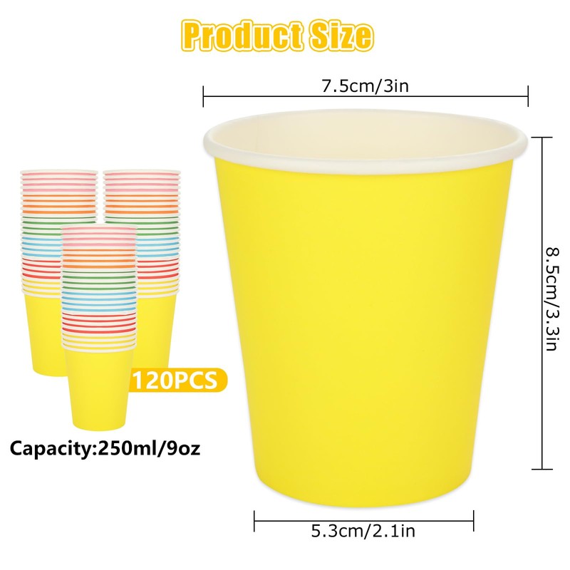 - 👍【PACKAGE INCLUDE】The package include 120 pcs paper party cups, capacity is 250ml / 9 oz, each size is 7.5x5.3x8.6cm, these quantities are enough for you to use for a long time.
