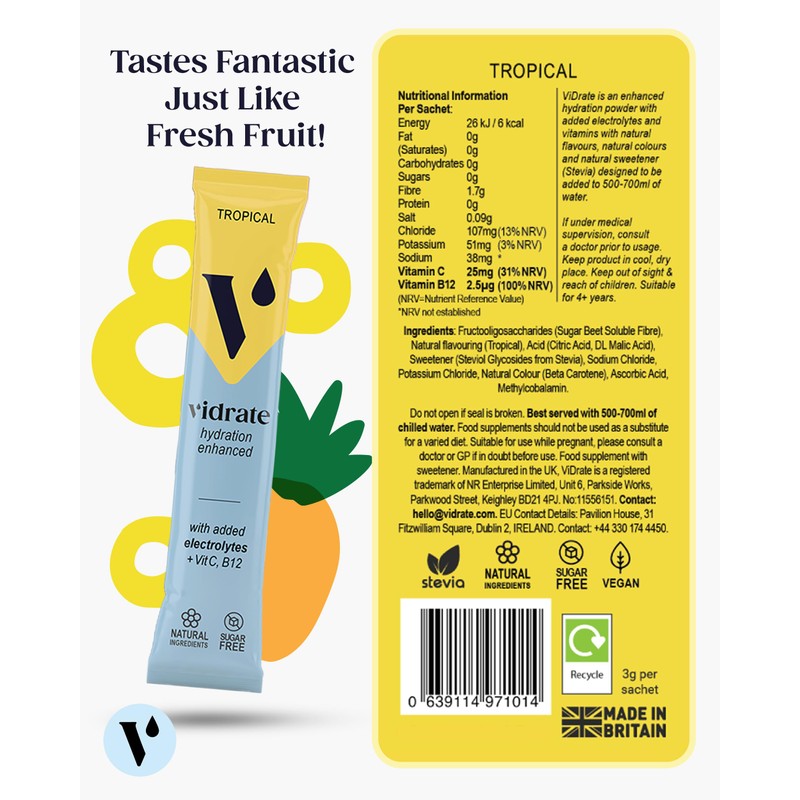 ViDrate Electrolytes Powder - Hydration Sachets Packed with Vitamins - Zero Sugar Rehydration Sachet with No Artificial Sweeteners & Preservatives by ViDrate - Tropical Large Pack, 20 Electrolytes Sachets