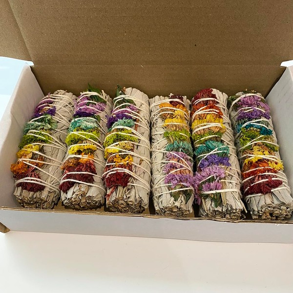 VIE Sage Smudge Stick, White Sage and 7 Chakra Flowers 4", Pack of 6