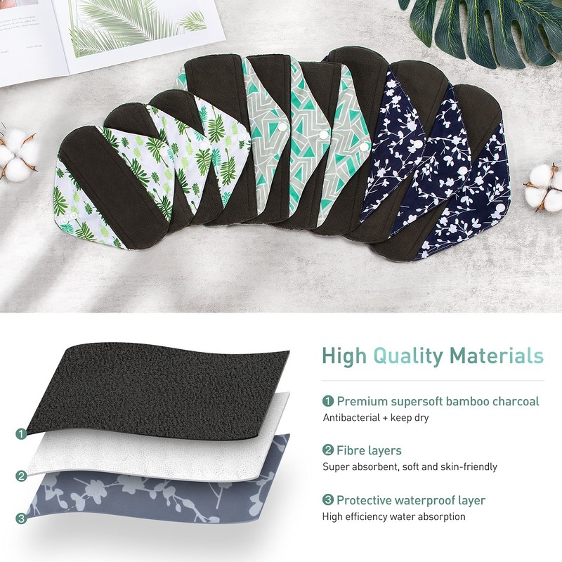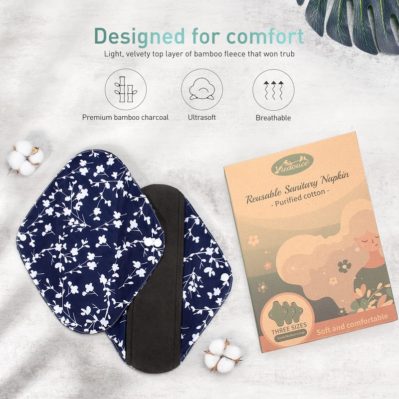- Hygiene: the reusable Viedouce sanitary pad consists of 4 protective layers: 1 x bamboo charcoal fibre surface, 2 x microfibre intermediate layer and 1 x outer layer made of PUL. The microfiber inner layer is super absorbent, which can eliminate odors and keep dry. The surface of bamboo charcoal fiber has antibacterial, healthy and soft properties to care for your skin. The PUL outer layer is waterproof to avoid leaks.