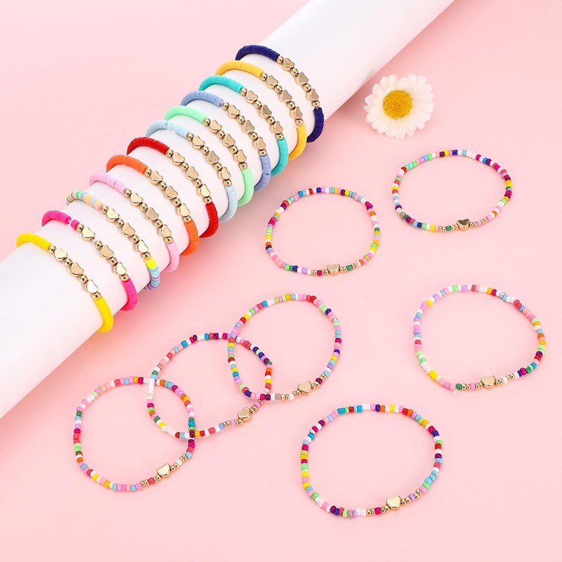 ViEinkaufen 19Pcs Girls Friendship Bracelets Set, Adjustable Elastic Beaded Bracelets with Heart Charms Bohemian Bracelet Jewellery Gifts for Best Friends Teens Women
