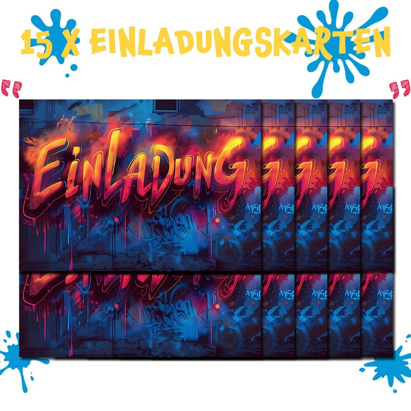 - You will receive: 15 colourful German invitation cards in graffiti style, printed on both sides on 300 g postcard box in DIN A6 format (10.5 cm x 14.8 cm). **Please note that envelopes are not included and must be purchased separately or prepared by yourself**.