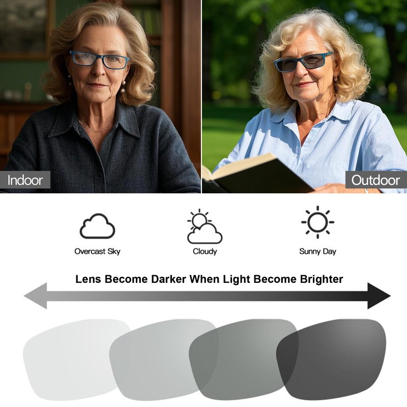 - Adaptive Photochromic Lenses: Experience seamless transition with our VIEWBETTER innovative photochromic lenses. Indoors or in low UV conditions, the lenses remain clear to provide you with clear vision. Outdoors, they automatically darken to a stylish deep gray as sunlight intensifies, ensuring optimal comfort and glare reduction in any environment.