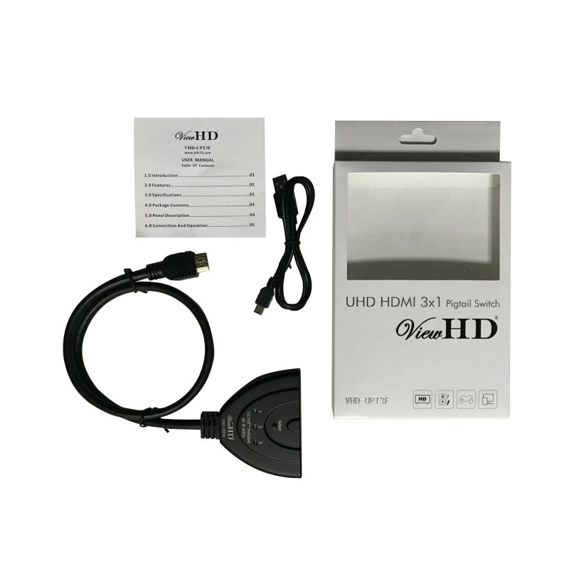 ViewHD Three Port HDMI Switcher 3x1 Switch 4K@60Hz HDMI 2.0 HDCP 2.2 HDR 3FT Pigtail