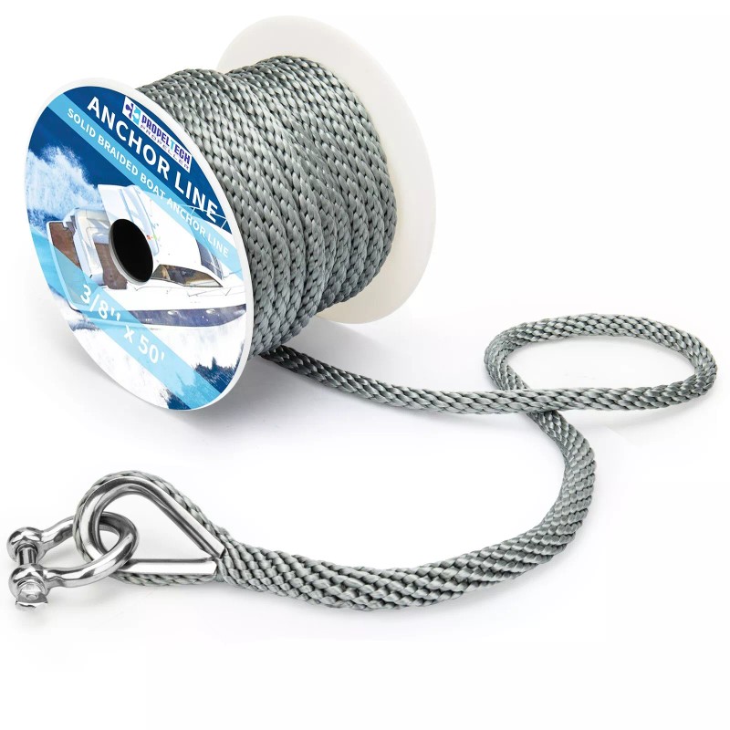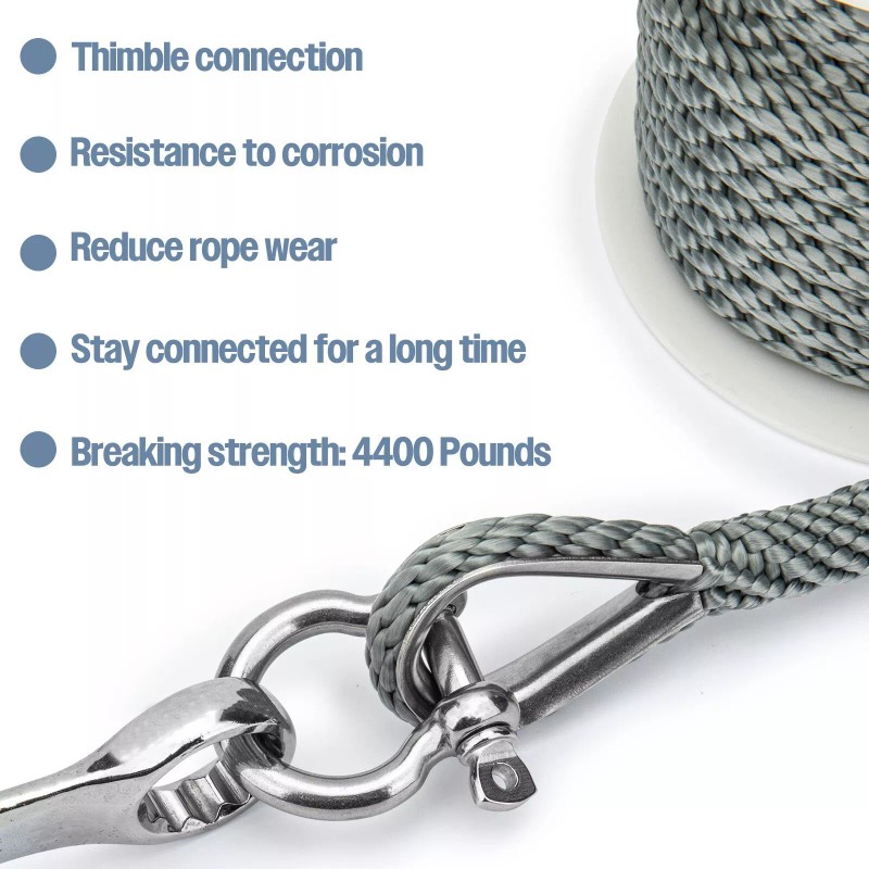 Anchor Rope Braided Anchor Line(White, 3/8" x 50') Premium Solid Braid MFP Boat Rope with Stainless Steel Thimble & Shackle, Quality Marine Rope, Boat Accessories