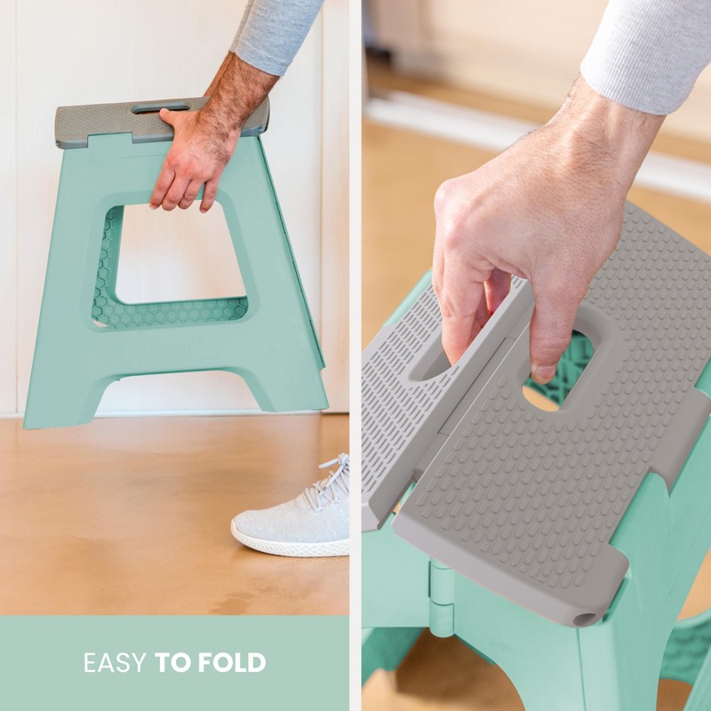 Distinctly designed, this stylish folding stools for adults unique aesthetic adds a fun twist to an everyday tool. Vigar's Compact Stepping Stool is the perfect addition to your home's kitchen, bathroom, or any space where a little extra height is helpful. Made from durable polypropylene built to last, this multipurpose foot stool lets you clean the top of the refrigerator, reach high cabinets, use a shower stool for inside shower, and use a kitchen step stool for adults. A strong, textured base prevents slippage, and stabilizing, non-slip rubber feet keep the heavy duty step stool in place. Foldable step stool for adults, an internal two-handle makes for easy carrying and hanging storage. Simply folds and unfolds with a single, effortless movement. It holds up to 330 pounds, and it measures 16.5-inch high by 1.2-inch wide by 13.5-inch long when folded and 12.6-inch high by 11.0-inch wide by 13.5-inch long when unfolded. for easy storage in your cleaning closet. To clean, wipe with a cloth and water as needed.