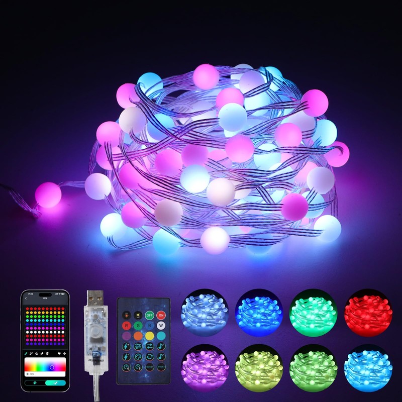 • DIY & Flexiable - With 16 million vibrant colors, each globe on this Christmas string lights can be individually customized—set a single solid color or mix and match for dynamic effects. The bendable, flexible wire allows you to shape it into any design you like, making it a versatile choice for both indoor and outdoor decorations. Perfect for creative DIY projects like trimming Christmas trees, wrapping garlands, accenting stair rails, classroom decor, and more