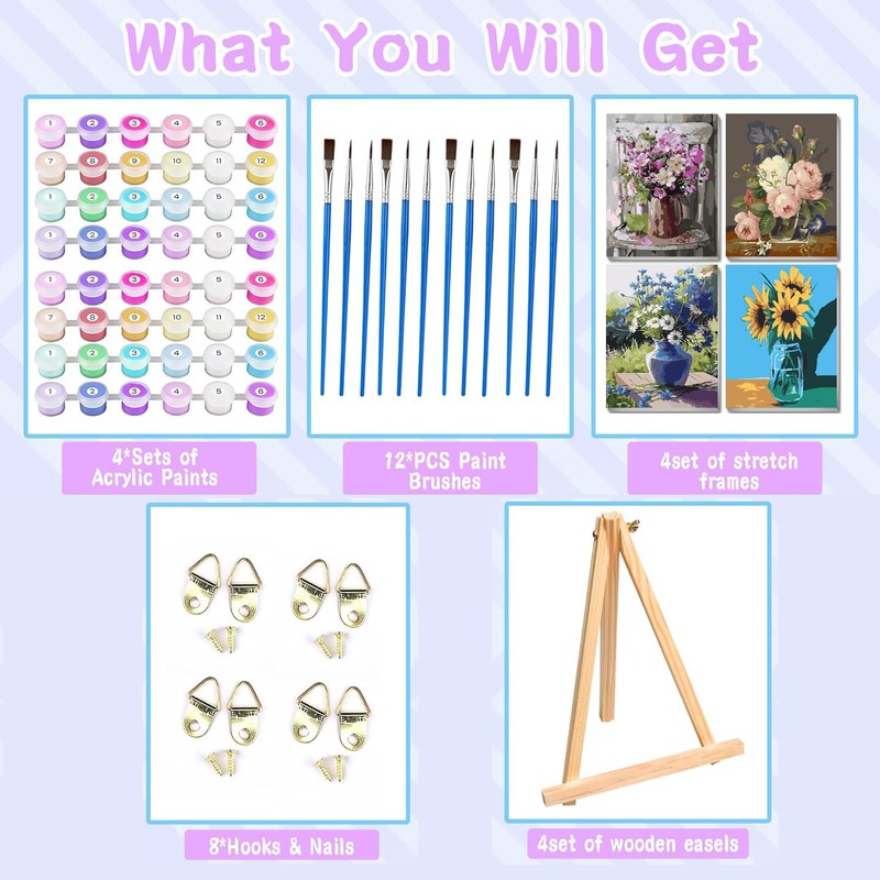 - 【What You Will Get】4 pre-printed canvas with Frame, 4 set of acrylic paint,1 Wooden Easel,12 high-quality brushes, 4 paper copy of numbered canvas for reference, 8 metal hanger.