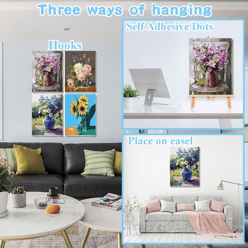 VIGEGU 4 Pack Flower Paint by Numbers kit for Adults Beginner Framed - with Wooden Easel,Flower Vase Paint by Numbers with Frame DIY Adults' Paint-by-Number Kits for Wall Decor12x16inch
