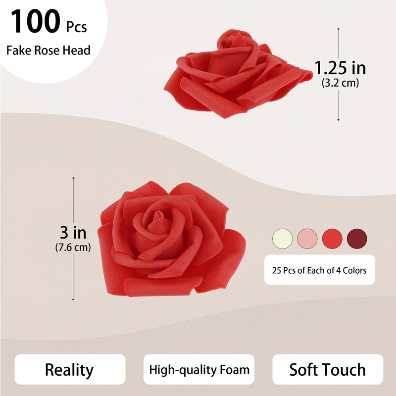- Package: Include 25 pcs coral red rose heads, 25 pcs wine red rose heads, 25 pcs peach rose heads, 25 pcs ivory rose heads, 100 pcs rose torus, 100 pcs rose stems, 10 pcs 6-leaf rose leaves, 2 pcs hot melt glue sticks