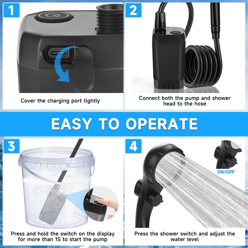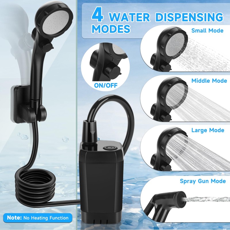 - 【Lightweight and easy to carry】 The camp shower kit includes 1x multi-mode shower head, 1x spray gun head, 1x electric water pump, 1x 6.7-foot water pipe, 1x multi-purpose hook, 1x Type-C charging cable, and a mesh storage bag for easy carrying and storage. The entire package measures 11 * 7 * 3 inches and weighs 2pound, making it very lightweight and portable, suitable for outdoor activities.