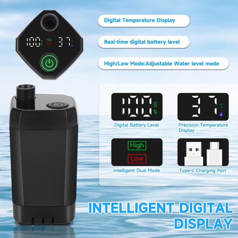 - 【Intelligent digital display】 The portable camping shower pump has intelligent LED digital display function, which can clearly display the current remaining power and water temperature (range 50-140 ° F/10-60 ° C). Note:Noheatingfunction. This portable shower pump has high power mode/low energy saving mode. When turned on,the default mode is high mode and lights up green.The water flow will be larger.When the pump switch button is pressed,it will switch to low mode and light up red