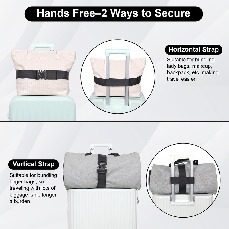 - Hands-Free and Convenient: This innovative luggage strap features both a vertical and a horizontal strap. One set can be used in two ways to meet your various travel needs of carry on bag. Giving you complete hands-free freedom wherever you go