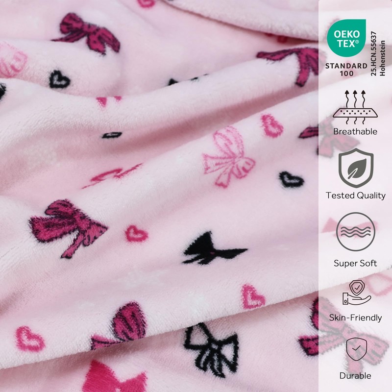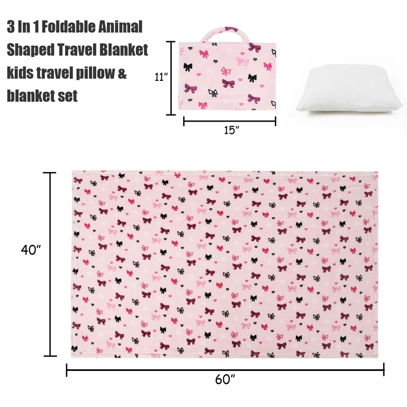 VigorSpring Kids Travel Pillow and Blanket Set, Pink with Bow Pattern, Soft Plush Throw for Airplane, Car, Nap Time