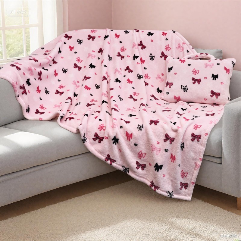 - VERSATILE SET: Matching pillow and blanket set featuring adorable pink and black bow patterns, perfect for travel, sleepovers, or cozy lounging at home
