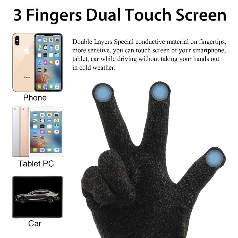 - 【3 Fingers Touchscreen】More Sensitive conductive fabric on thumbs, forefinger and middle finger, you can use smart phone, tablet or other touch screen devices without take off them in cold weather. (Ensure fingertips are full contact with gloves.)