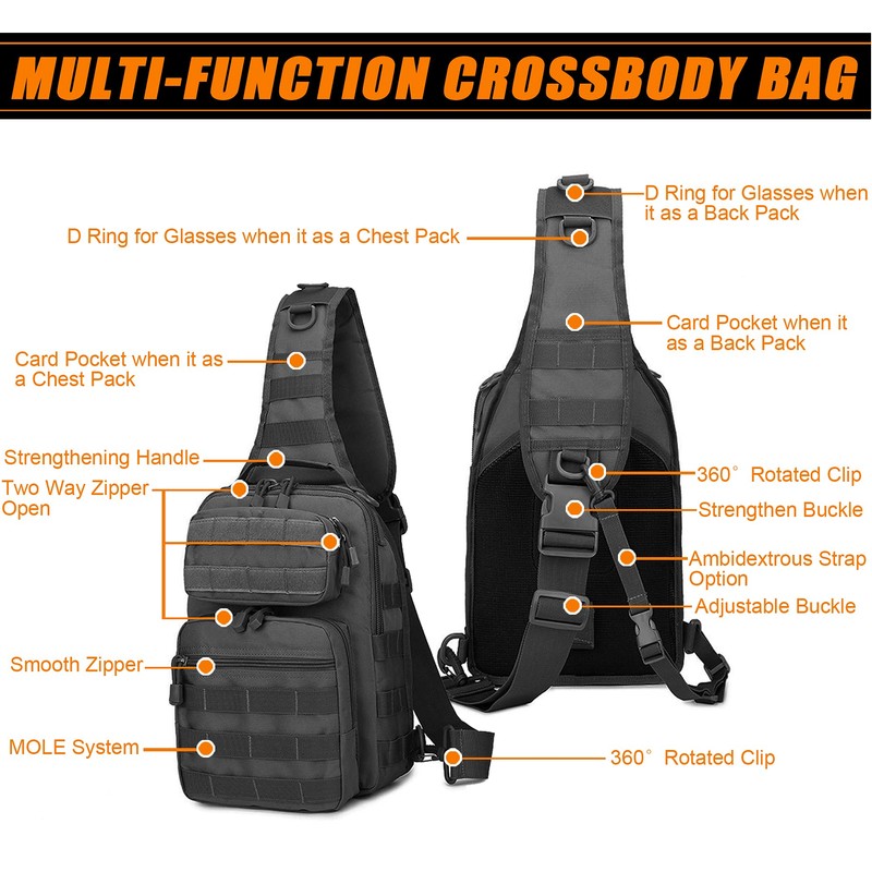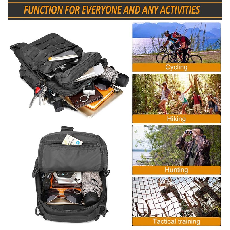 - 【Function for Everyone and Any Activities】- The tactical sling bag is great for indoor and outdoor.Multipurpose used for edc sling bag, crossbody backpack, shoulder strap bag, hand carry bag. It's for every day carry, travel, fishing, hunting, shooting, military, police, army, tactical, assault, war game, gear cargo, cs, expedition,adventure, wild game, wilderness survival, hiking, camping, trekking, climbing, cycling, gym, other sports. It's also a good choice for a gift