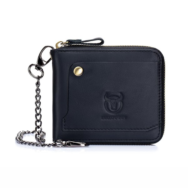 viizimei Men's Short Wallet, Bi-Fold Wallet, Leather, Zipper Closure, Chain, Genuine Leather, Compact, Vertical, Lightweight, Casual, Black