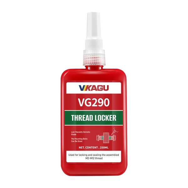 "VIKAGU Threadlocker 290 - Medium -Strength Thread Lock for Secure, Durable Fastening Ensure bolts, nuts, and screws stay firmly in place with VIKAGU 290 Thread Locker, a premium anaerobic adhesive designed to prevent loosening caused by vibrations, shocks, and thermal fluctuations. Perfect for automotive repairs, industrial machinery, bicycles, and DIY projects, this 50ml bottle delivers long-lasting security for threaded metal fasteners. Key Features & Benefits: - 290 High-Strength Formula: Offers robust, permanent bonding for metal threads—requires tools for disassembly, ideal for critical applications. - Vibration & Heat Resistance: Withstands temperatures up to 150°C (302°F) and harsh conditions, ensuring reliability in engines, heavy equipment, and high-stress environments. - Quick Cure Time: Sets in minutes for efficient repairs; full strength achieved in 6 hours. - Easy Application: Precision nozzle ensures controlled, mess-free application. One bottle covers hundreds of fasteners. - Versatile Use: Compatible with steel, aluminum, brass, and other metals. Suitable for automotive, HVAC, plumbing, electronics, and more. How It Works: Apply 1-2 drops to clean, male threads before assembly. The adhesive cures anaerobically (without air) when confined between tightly fitted metal surfaces, forming a durable, gap-filling seal. Why Choose VIKAGU 290? - Trusted Quality: Engineered to meet industrial standards for durability and performance. - Leak-Proof Design: Secure cap prevents drying and extends shelf life. - Compact & Portable: 50ml size fits in toolboxes for on-the-go repairs."