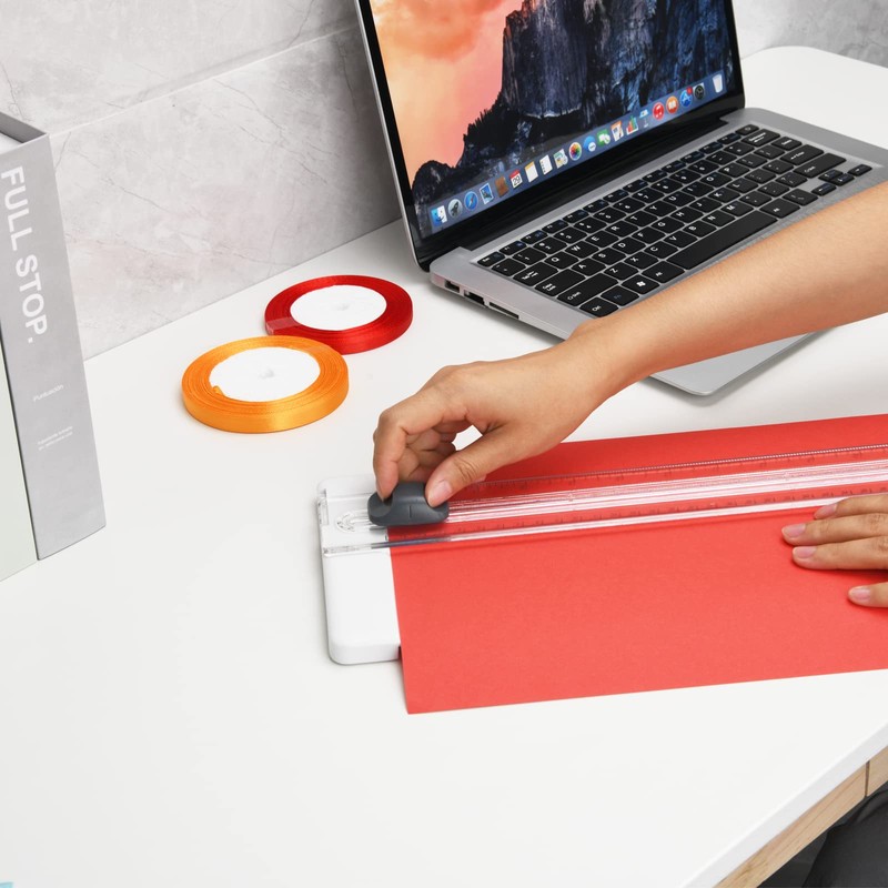 - The paper cutter make straight ,accurate cuts through a variety of materials, it work Precisely and perfectly, Just swing the arm out(or not) press your paper against the bumper line, line up the cutter , then press and slide. It totally perfect straight cut in performance.