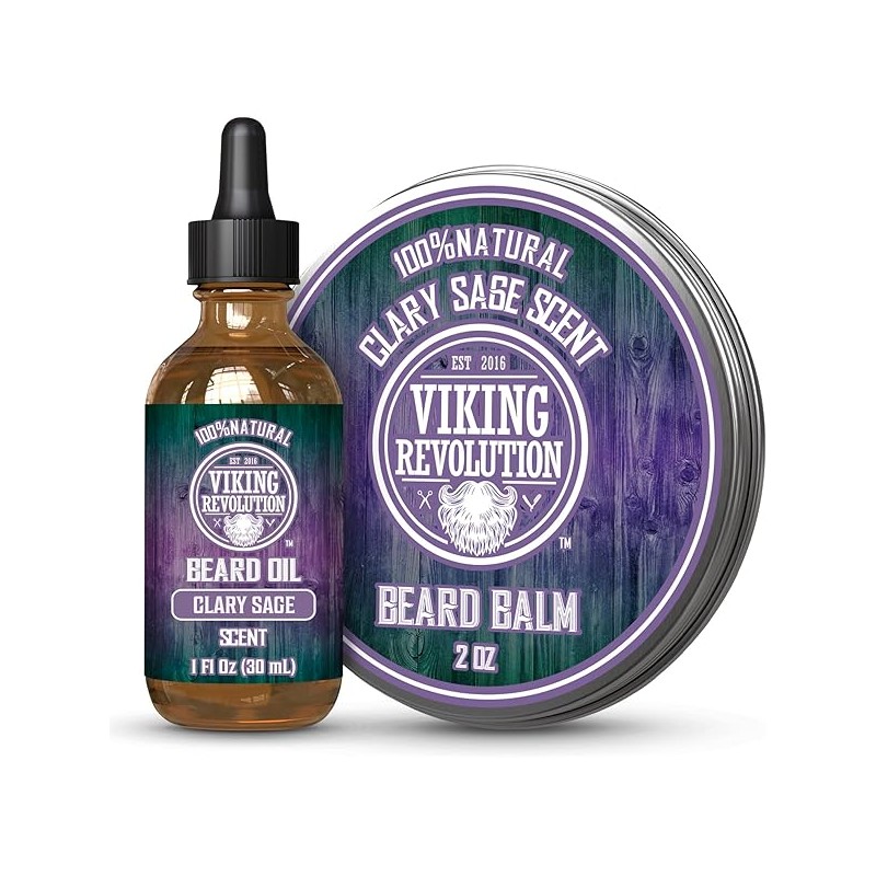 Viking Revolution Clary Sage Beard Balm for Men and Clary Sage Beard Oil Bundle - With Argan and Jojoba Oils - Soften and Moisturize your Beard