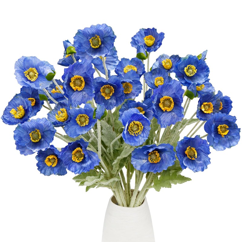 - Quantity and Size: Blue poppies flowers artificial come in 12 stems, each 23 inches (approximately 68 cm) tall. Each stem contains three silk flowers and one bud.