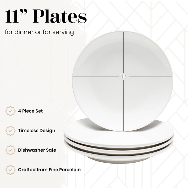- VERSATILE 11” PLATES: Our extra large plates are perfectly sized for enjoying a big dinner, and they can be used for serving, too. Four piece set gives you enough dishes to go around without taking up too much space in the cupboard.
