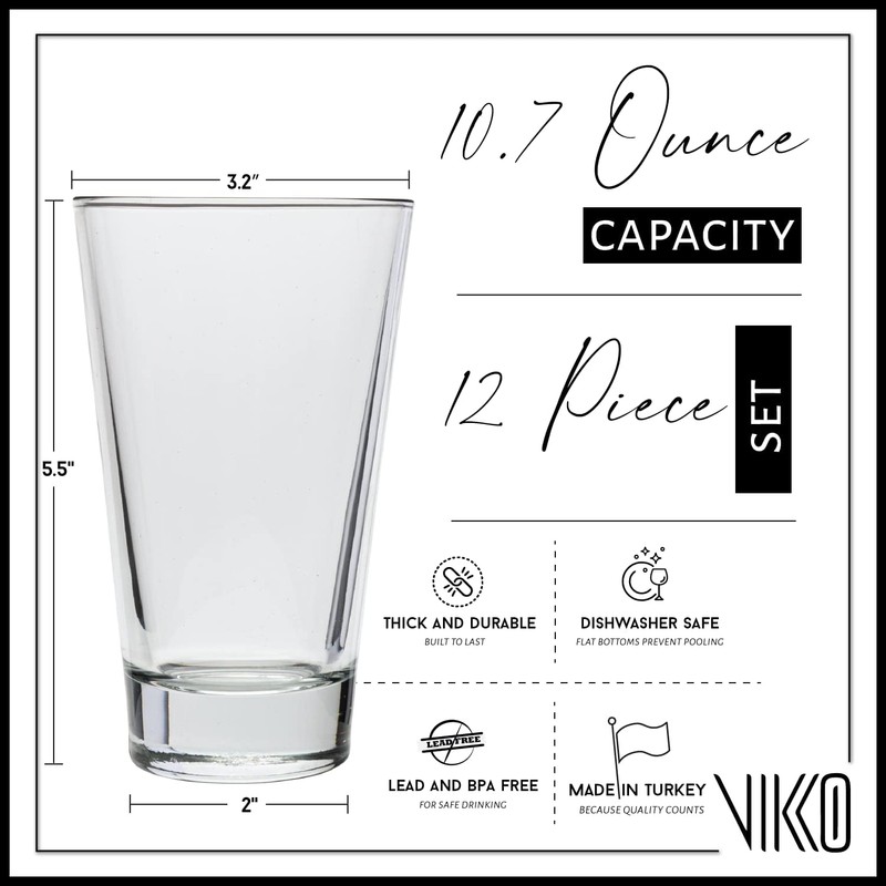 Vikko Drinking Glasses, 10.7 Ounce Drinking Glasses, Pack of 12 Crystal Clear Glass Cups for Water or Juice, Elegant Glass Tumbler & Water Glasses for Drinking