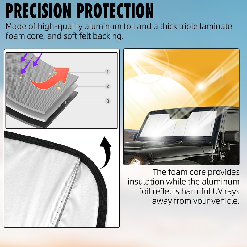 - HIGH-QUALITY UV SHIELD FOR JEEP WRANGLER WINDSHIELD - Made of high-quality aluminum foil and a thick triple laminate foam core, and soft felt backing. The foam core provides insulation while the aluminum foil reflects harmful UV rays away from your vehicle.