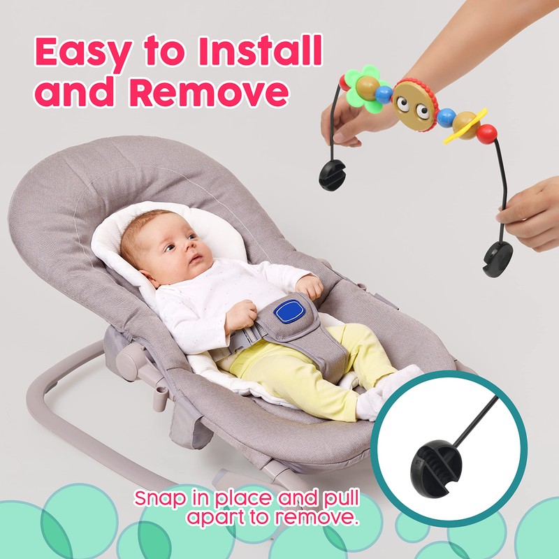 - EASY TO INSTALL AND REMOVE: Snap in place and pull apart to remove. You can adjust the bar position lower or higher as needed. Note: only install or remove when the baby is not in the bouncer