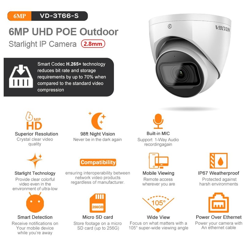 The 6MP turret camera records at 3072 x 2048@30fps pixels with a 1/2.7" 6MP progressive CMOS high-performance sensor and a 2.8mm fixed-focus lens which provides an ultra-wide 102° viewing angle,98 feet of infrared night vision distance.Smart Detection(IVS)& Perimeter Protection:6mp IP camera featured advanced person/vehicle detection based on high technology detection algorithms helps identify real threats, and when an alarm occurs, the 8mp POE camera captures it in time and sends an alarm message to your app. In restricted area (such as pedestrian area and vehicle area), the false alarms of intelligent detection based on target type (such as tripwire, intrusion) are largely reduced.Dual H.265 Compression POE Camera:The 6mp IP POE camera with High Efficiency Video Coding, providing high-quality video, and reduces the cost of storage and transmission. Power Over Ethernet (POE camera) for easy installation, only single Ethernet cable for power and data connection, plug in POE injector/switch/NVR and the camera will be up and running, simplifies installation, and lowers cabling costs.P2P Real-time Remote Monitoring:Access App or Google Play Store through your smartphone to download the Videolink or DMSS app for iOS or Android devices for P2P control,Free PC software(SmartPSS) or third-party software such as Blue Iris,you can achieve real-time monitoring.IP67 Weatherproof &IK10 vandal-resistant: the IP camera outdoor come with IP67 water and dust resistant and IK10 vandal-resistant,professional IP security camera can withstand temperature ranges from -22°F to 140°F(-30°C to 60°C), which means this 6MP security outdoor camera is strong enough to withstand rough weather, even in the storm and snowy weather.One-way audio can capture the camera surround sounds making videos more real.