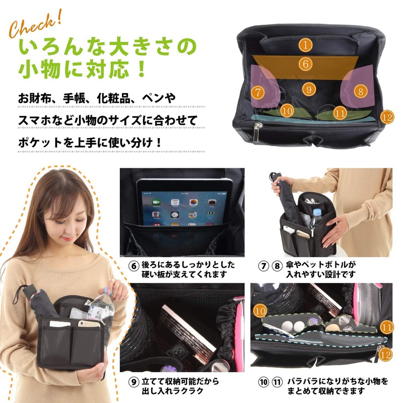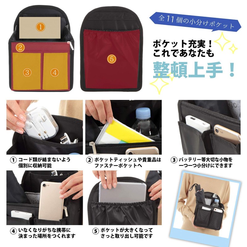 VILAU Bag in Bag, Backpack, Large, Improved Back Pocket, Tote Bag, Small Backpack, With PP Bottom Plate, 10.6 x 7.9 x 5.1 Inches (27 x 20 x 13 cm)