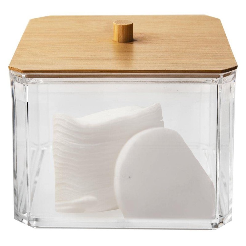 Vilde Storage Container for Cotton Buds Cotton Buds Holder Cotton Buds Dispenser with Bamboo Wood Lid for Bathroom 9.5 x 9.5 x 8.5 cm