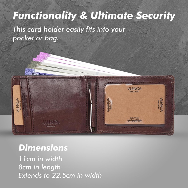 Introducing the Vilenca Holland Premium Leather Card Holder, the epitome of style and functionality. Crafted from high-quality leather, this sleek accessory is designed to elevate your everyday carry. Available in six sophisticated colors - black, brown, cognac, navy, red, and grey - there's a shade to suit every taste and style. Featuring a convenient metal money clip, this card holder ensures your cash stays secure while you're on the move. Its compact size when folded, measuring at 11cm in width and 8cm in length, makes it perfect for slipping into your pocket or bag. When unfolded, it extends to 22.5cm in width, providing ample space for your essentials. Stay organized with one PVC compartment, three dedicated credit card slots, and an external compartment for quick access to frequently used cards or IDs. Plus, with RFID blocking technology, your personal information stays protected from unauthorized scans. Experience the perfect blend of form and function with the Vilenca Holland Premium Leather Card Holder. Elevate your everyday carry with this stylish accessory.