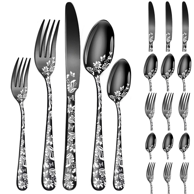 - UNIQUE & ELEGANT DESIGN : This tableware sets features exquisite floral laser-etched patterns, an elegant appearance, and smooth designed handles, with smooth polished edges and no rough spots, making the sharp knives more effective at cutting food.