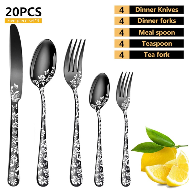 - COMPLETE 20PCS FLATWARE SET SERVICE FOR 4 : The black cutlery set consist of 4 Dinner Knives, 4 Dinner Forks, 4 Dinner Spoons, 4 Teaspoons and 4 Dessert Forks. This utensil sets is perfect for most family of 4 people