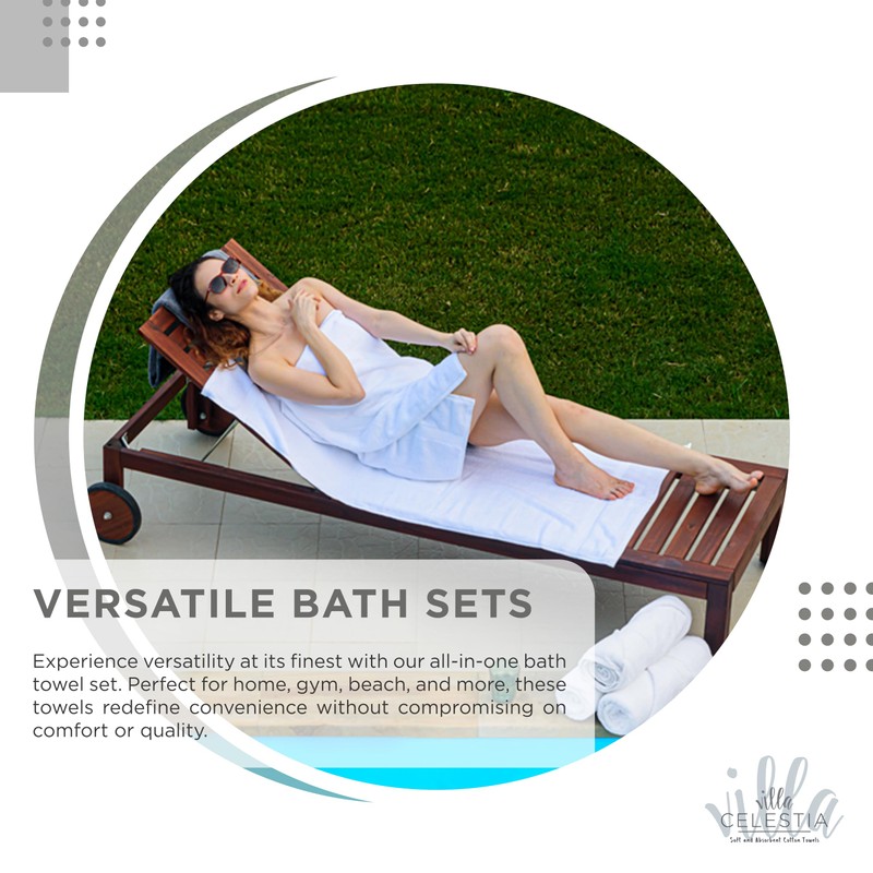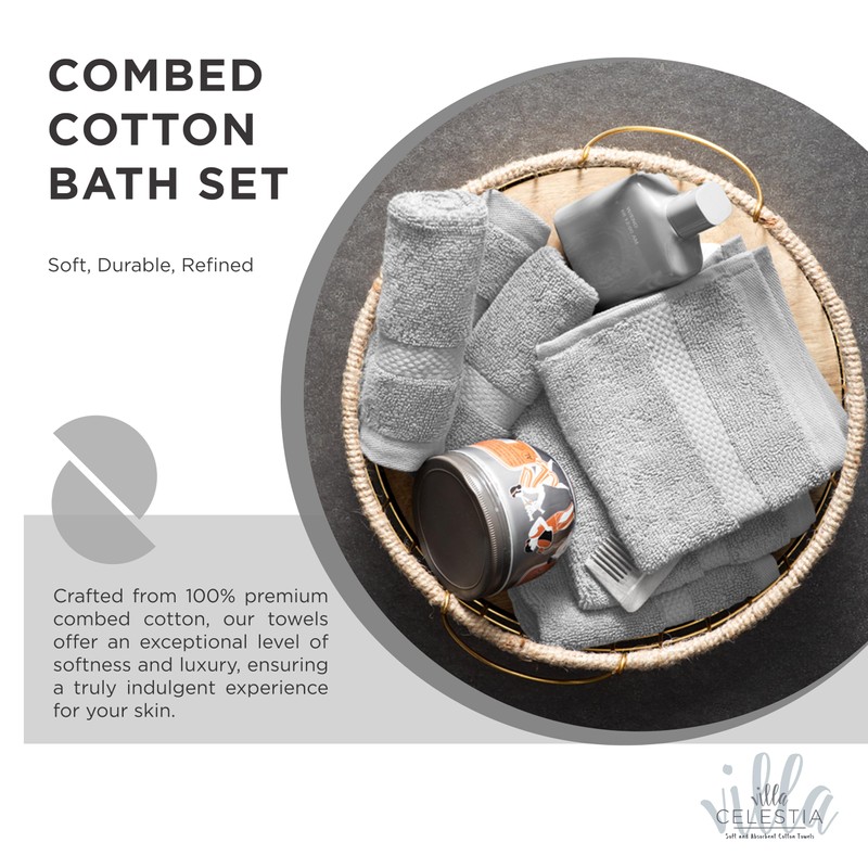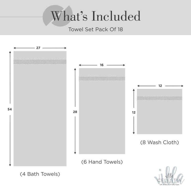 - VILLA CELESTIA LUXURIOUS TOWEL SET (PACK OF 18): Uplift your mood and bathing experience with the super soft and luxurious touch of our Villa Celestia Bath Towels Set. Bundled in a 18 pack design, our towel sets for bathroom consists of 4 Bath Towels (27” X 54”), 6 Hand Towels (16” X 28”), and 8 Washcloths (12” X 12”), giving you the complete package of comfort, indulgence, and delight.
