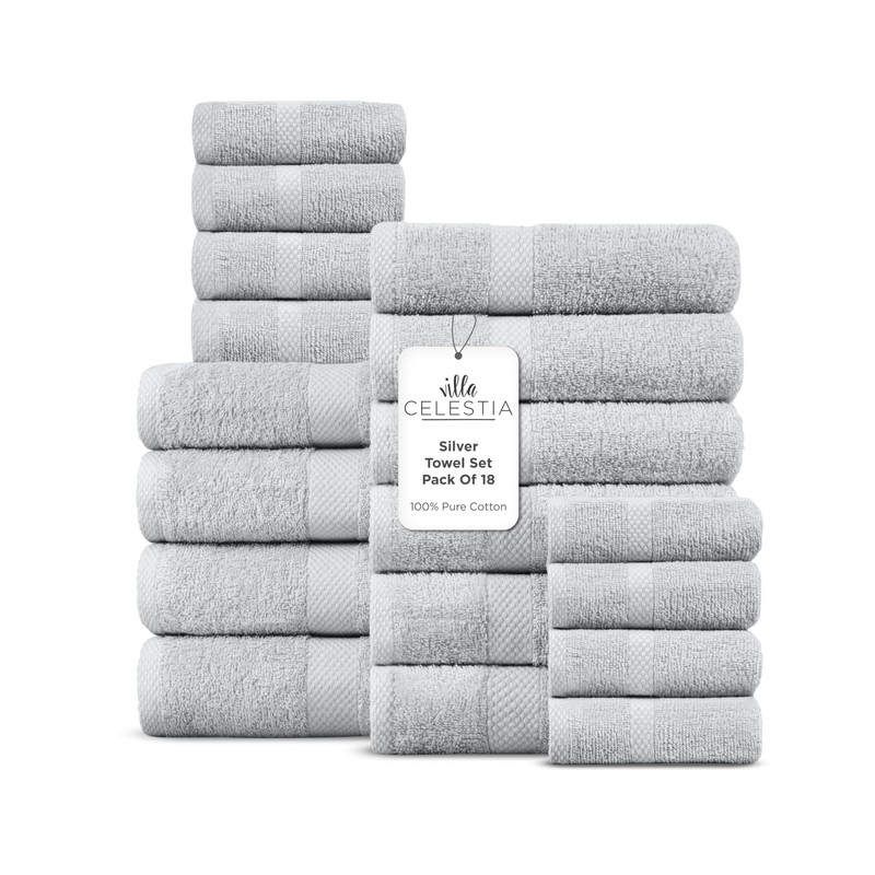 Villa Celestia 100% Cotton Bath Towel Set of 18-4 Bath Towels, 6 Hand Towels, 8 Wash Cloths, Sustainable, Soft, Highly Absorbent, Combed Cotton 18 Piece Set for Hotels, Spa, Bathroom, Dorm, Silver