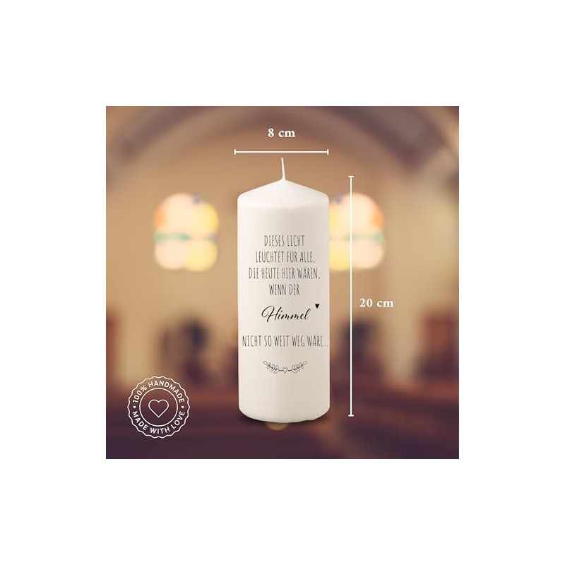 Unsere handgefertigten Grabkerzen aus veganem Paraffinwachs sind herzliche Erinnerungen an Verstorbene. In zwei Größen (15 cm x 7 cm und 20 cm x 8 cm) verfügbar, tragen sie einfühlsame Sprüche und Botschaften. Nicht nur für Grabstätten, sondern auch für Hochzeiten und Gedenken geeignet , werden sie sorgfältig in Seidenpapier verpackt. Die Einzigartigkeit unserer Kerzen zeigt sich in ihrer Handarbeit, die sie zu besonderen Geschenken für trauernde Freunde und Familien macht. Die 20/8cm Kerzen werden inkl. Band versendet. Finden Sie das perfekte Trauergeschenk oder eine herzliche Gedenkkerze, um den Verstorbenen zu ehren. Unsere Kerzen sind auch als Friedhof Deko und Grabschmuck erhältlich, um Ihre Erinnerung zu bewahren. Ihre Lieben werden in unseren Kerzen weiterleben. Jede Kerze ist ein UNIKAT! Die Kerzen werden mit viel Liebe zum Detail am PC entworfen & personalisiert, auf Folie gedruckt, „VON HAND“ auf die Kerze gebracht und versiegelt. Dadurch bekommen sie ein schönes Finish und das Motiv ist geschützt! Eure Artikel verschicken wir sicher und verschenkt fertig in Seidenpapier verpackt und mit einer kleinen handgestempelten Botschaft (Eurem Anlass entsprechend). Die Bändchen werden, wie in den Bildern zu erkennen, farblich an das jeweilige Motiv abgestimmt!