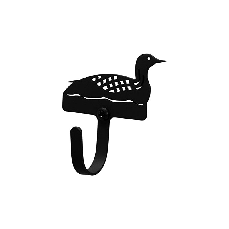 Wrought Iron Loon Decorative Wall Hook Sm :: 1.25 Inch Opening Hook Depth (dimension extending out from wall to end of the curve) Our hooks can safely hold up to 10 lbs. of weight when mounted to a secure surface. It is easily to fill up your home with trinkets and ornaments. Soon you may discover you have no room left! Perhaps your home only offers so much wall space to begin with. Either way, this small wall hook is just the thing to add to your wall decor without taking up too much valuable space! The look is perfect for any wildlife or nature theme. Hang your belongings on the handy hook that extends from the bottom of this unique wrought iron ornament. The single piece design features a strong hook that is perfect to hang just about anything. Each of these wall ornaments measures 3 and 1/4 inches high with a 1 and ¼ inch hook depth. The top is shaped to look like a roosting or floating loon. The bird’s back is accented by a cut out pattern, designed to look like feathers. Mounting screws are included and will secure this attractive black wrought iron hook to your wall at the hook’s center. Get more hanging options in a single small wall hook! This fun bird hook is perfect for any wildlife home decor, or for anyone who has a fondness for natural style. The more you buy, the more you can save! PRODUCT SPECIFICATIONS Item Height: 3.25 In. Item Width: 1.25 In. Item Length: 2.75 In. Product Weight: 2 oz Color: flat black Packaging: Product is sold Individually (you are purchasing one item) Material: wrought iron containing alloys of .01% to .29% carbon and iron Finish: Hand crafted wrought iron for indoor or outdoor use. (heavy duty metal) in a flat powder coating finish :: lead free, long lasting & rust resistant Country: MADE in the USA :: Supporting United States craftsman.