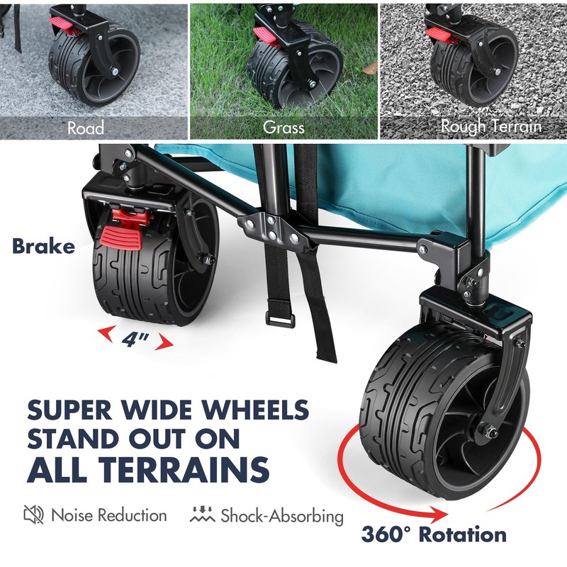 - Wider Wheels & Dual Brakes: The oversized 4" wheels have a unique anti-skid pattern, enabling our folding station wagon to haul loads on various terrains, including road, grass, and even rough terrain. Our ATV wheels are much wider than similar folding trolleys, which greatly improves the steering performance. The double front wheels can be rotated 360 degrees for easy maneuvering. The dual front wheels also come with brakes to keep them firm when stationary, even on slopes