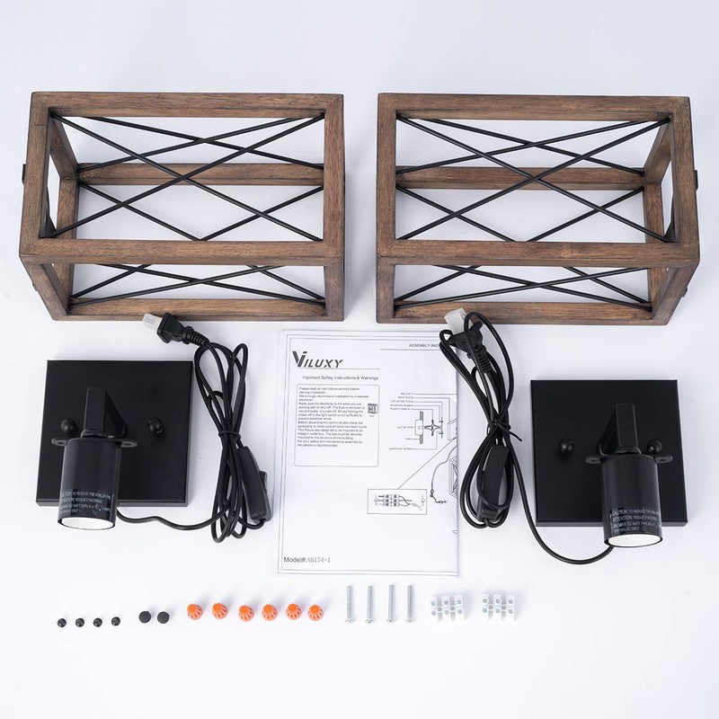 VILUXY Wood Wall Sconces Retro Industrial Rectangle Bedside Wall Sconce Plug-in Cord with Switch Lighting Fixture Black Wall Lamp for Bedroom, Hallway, Entryway, Passway, Dining Room 2 Pack