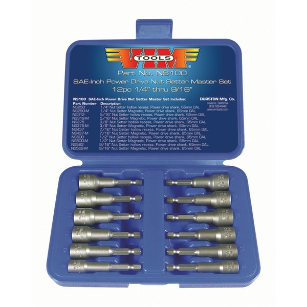 VIM Tools NS100 12-Piece SAE Power Drive Nut Setter with Magnetic and Hollow Point Drivers