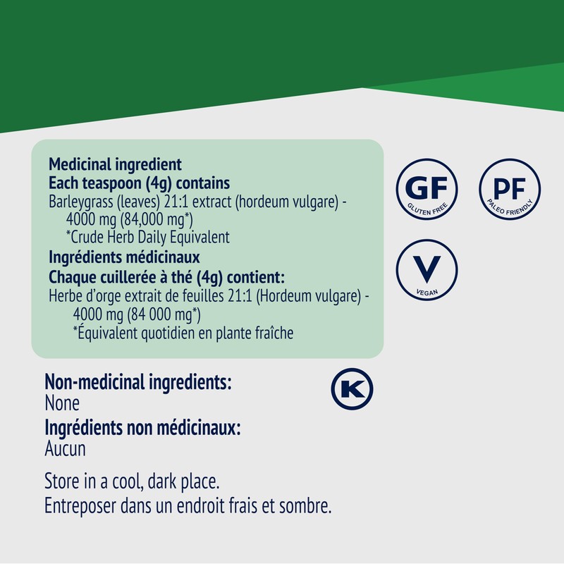- 4g Barley Grass Powder C Each serving contains 4g of concentrated 21:1 barley grass juice powder.