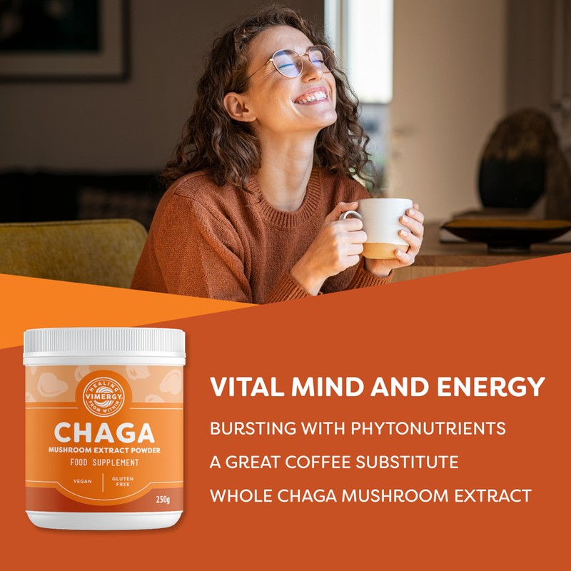 - CHAGA MUSHROOM POWDER SUPPLEMENT: Pure powdered chaga mushroom extract. SUPERFOOD: Chaga is bursting with polyphenol phytonutrients. COFFEE SUBSTITUTE: Vimergy Chaga mushroom powder makes a great coffee substitute. Contain several active compounds including polysaccharide complexes, melanin, and polyphenols. FORMULATED AS: gluten-free, Non-GMO & Paleo friendly vegan supplement.
