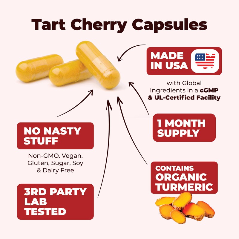 - NO SOUR TASTE - Our Tart Cherry Tumeric Supplement is a convenient way to reap all the benefits of Tart Cherry without the hassle of juicing. These easy-to-swallow Tart Cherry capsules are perfect for use after meals.*