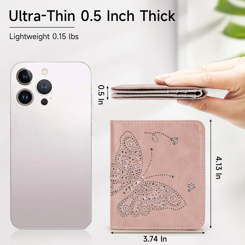 - Material:Superior PU leather makes wallet glossy, soft, tear-resistant and easy to clean. Available in various colors and patterns. Cute hollow out shining butterfly design