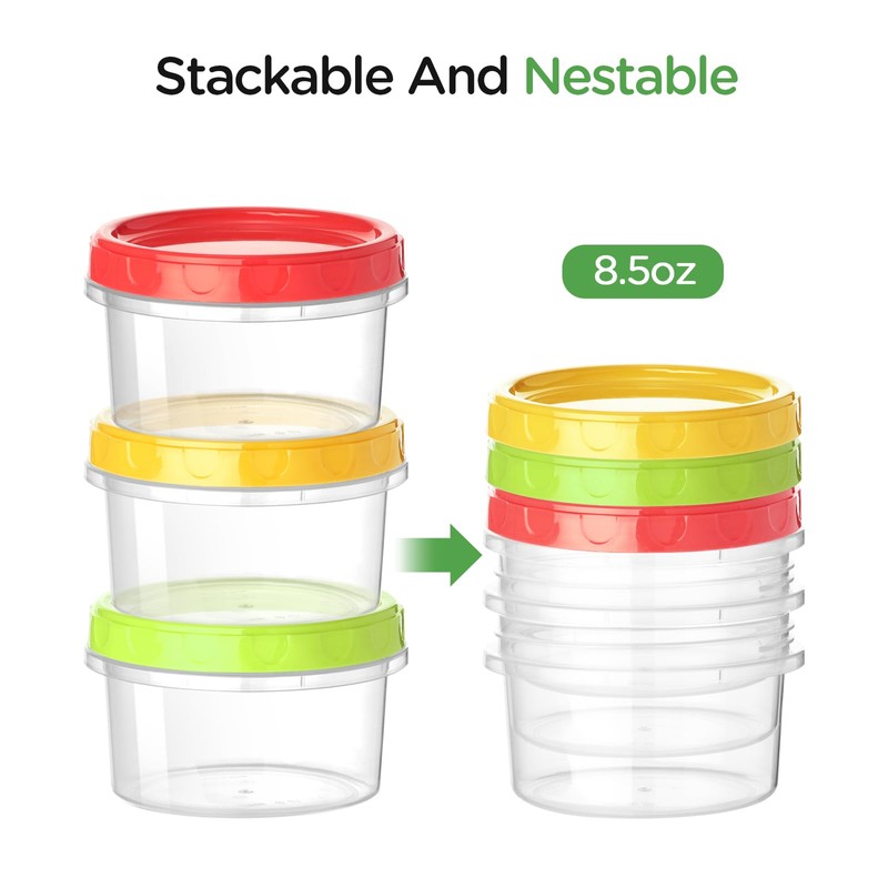 - Space-saving: thanks to the clever grooves, the plastic containers with lids can be stacked together to save space. This saves space in the cabinet, fridge or freezer. The small food storage containers are a good choice for an organised kitchen.