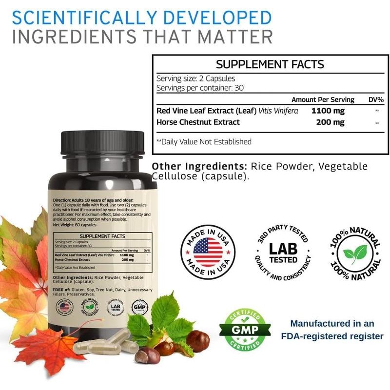 VINATURA Red Vine Leaf Extract - Horse Chestnut, 1300mg/serving *USA Made and Tested* Circulation and Vein Support for Healthy Legs - Helps Blood Flow, Leg Circulation - 60 Capsules (30 Servings) Healthcare, Dietary Supplement