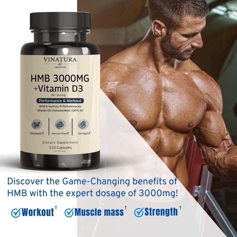 VINATURA HMB 3000mg and Vitamin D3 Supplement Capsules per Serving *USA Made & Tested* Promotes Muscle Growth & Recovery - HMB Supplement and Vitamin D3 (1600 IU) - 120 Capsules 30 Servings